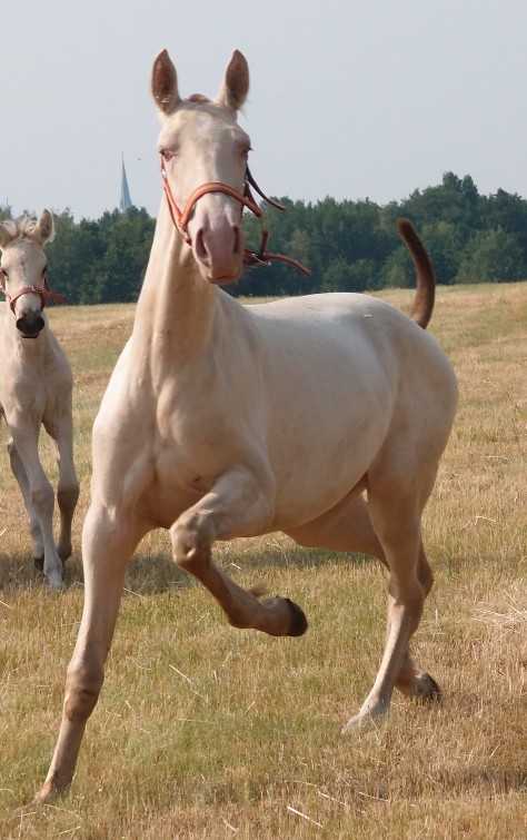 Homozygot Pearl (Prl/Prl) ähnelt der Phänotyp des Pferdes, dem eines Champagnerfarbenen, hat jedoch genetisch nichts mit ihm gemeinsam.